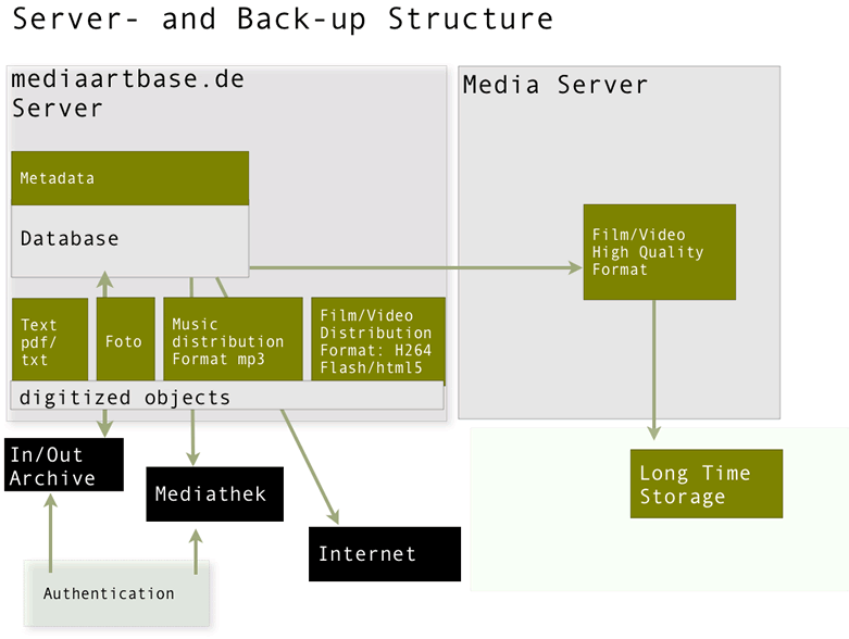 Moreover, the loss of traditional storage locations leaves the archive as the final refuge for many works. Therefore, the aim of the <mediaartbase.de> project is the creation of a dynamic network of archives which is intended to be globally accessible.