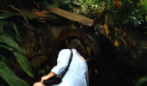 Like the waterwheel, this bamboo bridge creates a sound not normally heard in northern countries. In this excerpt, I am walking across the bridge. Notice the dense interweaving of noise bands (the water is more prominent than the air-conditioning here) and more tonal sounds such as the birdsong. Mingled with the sounds of my feet on the bamboo, this complex of sounds creates a dense and timbrally interesting soundscape.